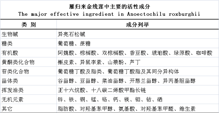 金線(xiàn)蓮(學(xué)名:Anoectochilus Roxburghii)別名金線(xiàn)蘭、金絲草,為蘭科開(kāi)唇植物花葉蘭屬多年生珍稀植物,被稱(chēng)為南方的“冬蟲(chóng)草”。據(jù)《醫(yī)藥典籍》中記載,金線(xiàn)蓮具有清熱涼血、祛風(fēng)利濕之功效,其氨基酸組成、成分、含量及抗衰老性微量元素的含量均高于國(guó)產(chǎn)和野生西洋參。幾百年來(lái)不僅在中國(guó)藥食同源飲食文化中得以傳承,也是自然界中飛禽走獸用于自我療傷的良藥。金線(xiàn)蓮于1990年被國(guó)家列為瀕危藥用植物。