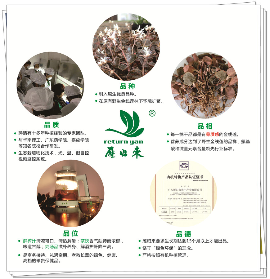 雁歸來秉承“綠色環(huán)保、保健養(yǎng)生”的企業(yè)使命,旨在從品種、品質、品樣、品味、品德五個角度將雁歸來品牌打造成為未來健康產(chǎn)業(yè)主力軍,致力于讓“來自葉帥故里、中國長壽之鄉(xiāng)”的雁歸來產(chǎn)品傳遞健康,福澤社會。